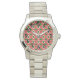 Diese Frauenuhr hat ein geometrisches Design aus sich wiederholenden roten und tiefen roten Dreiecken, mit grünen Kreisen oben auf einem Feld von weißlich. Das gleiche Design in verschiedenen Farben gewollt? Nachricht.
