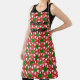 Diese Schürze hat ein geometrisches Design, in dem sich die roten und tiefroten Dreiecke wiederholen, mit grünen Kreisen oben auf einem weißlichen Feld. Das gleiche Design in verschiedenen Farben gewollt? Nachricht.