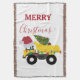 Eine niedliche Abbildung eines LKW-Bauwagens für Weihnachten, das eine Weihnachtsmannmütze trägt und in Weihnachtsbeleuchtung mit den Worten "Frohe Weihnachten" dekoriert ist und einen Weihnachtsbaum transportiert. Ideal für Jungen und Mädchen, die LKW, LKW oder schwere Maschinen Liebe bauen. Eine ideale Weihnachtsdecke für dump-LKW-Liebhaber, groß oder klein, Mädchen oder Jungen.