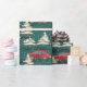 Ein wunderschönes Muster mit roten Autos, die zwischen schneebedeckten Pinienbäumen fahren, Set vor einem üppigen grünen Hintergrund, das den Geist der Urlaubssaison und die Freude an der Geschenkidee einfängt.