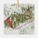Die schöne Weihnachtsverzierung, die einen Kardinal und ein blaues Jay kennzeichnet, hockte auf Schnee umfaßten Kiefernniederlassungen.
