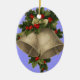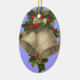 Diese Oval Weihnachtsverzierung kennzeichnet Glocken auf der Front mit einem Hintergrund des violetten Blaus, mit Luke, Kapitel 2, Vers 14 auf der Rückseite. "Ruhm zum Gott im höchsten und auf Erdfrieden, Wohlwollen in Richtung zu den Männern.
