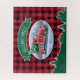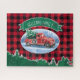 Fügen Sie Ihren Familiennamen diesem Feiertagspuzzlespiel hinzu, das eine Winterszene eines klassischen roten Lieferwagen-LKWs kennzeichnet, der durch den Schnee, ein frischer Weihnachtsbaum in der Rückseite fährt. Eine grüne oben genannte Fahne hat einen Familiennamen, damit Sie mit Ihren Selbst personifizieren. Hintergrund ist ein Karomuster des roten und schwarzen Büffels mit einer Grenze der grünen Kiefernbäume und einem Besprühen des Schnees.