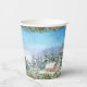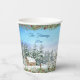Diese Weihnachtspapiertassen eignen sich perfekt zum Feiertagseinhalt, zusammen mit den passenden Tellern und Servietten in der Kollektion. Die blaue Aquarelllandschaft im Winter hat eine gemütliche Hütte inmitten schneebedeckter Bäume, in der mehr Schneeflocken fallen.
