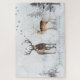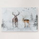 Aquarellbilder illustrieren Weihnachtshirsche in einer Winterlandschaft mit Text-Gruß der Saison. Bäume und fliegende Vögel im Hintergrund.