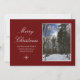 Frohe Weihnachts-Natur-Feiertagskarte mit einer Winterwaldszene nach neuem gefallenem Schnee. Set auf einem roten Hintergrund, können Sie mit weißen Schriftzeichen anpassen. Sie können auch Ihr eigenes Foto hinzufügen. Eine schöne Karte für den Versand von Ferien wünscht Ihren Freunden und der Familie.