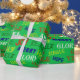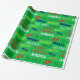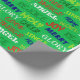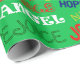 Dieses Verpackungspapier hat ein weihnachtliches Design von Wörtern, die in Rot, Gelb, Grün, Blau und Weiß verstreut sind.