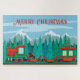 Weihnachtspuzzle mit dem frohen Weihnachtszug und dem kleinen schottischen Hund, der mitfährt. Sehr hell und farbenfroh für die Ferien-Puzzle-Party!
