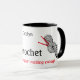 Diese weiße Tasse ist mit Schwarzweißbildern von Wollfächern geschmückt, jede mit zwei roten Häkelhaken und den Worten "Ich häkle, weil Stricken nicht aufregend genug ist". Es ist eine humorvolle Tasse, jemandem zu geben, der Lieben zum Häkeln hat, und mit jedem Namen personalisiert sein kann.
