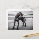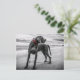 Foto eines Weimeraner Hundes an einem stehenden Strand, der zurückblickt. Foto in Schwarz und Weiß umgerechnet, mit Ausnahme des roten Hundebrags.