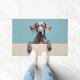 The cool silver blue background complements its coat perfectly, creating a modern and sophisticated look for any entryway. Designed with extra space at the top and bottom, it allows easy personalization with names, welcome messages, or custom text—making it ideal for unique dog-themed doormats and thoughtful gifts.