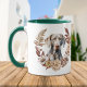 Ein hübscher Herbstkranz in den Farben Zimtbraun, Bräune und Creme umgeben das Aquarellbild eines wunderschönen Weimaraner Hundes. Das Bild wird zweimal auf der Tasse gedruckt, wobei der eigene Text dazwischen liegt.
