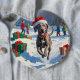 Ein schlanker Weimaraner läuft fröhlich durch die schneebedeckte Winterszene und trägt einen festlichen roten Weihnachtsmütze. Dieses elegante Design hebt den silbergrauen Mantel der Rasse, den athletischen Bau und die loyale Persönlichkeit hervor und erfasst gleichzeitig die Wärme und den Geist der Feriensaison. Ein herzlicher Winterurlaub voller festlichen Charme.