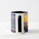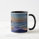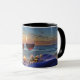 Eine hübsche Kaffee-Tasse am Strand bei Sonnenuntergang. Eine Küstentasse mit zwei Gläsern Wein auf einem rustikalen Tisch mit Kerzen, Sonnenuntergang und Meer oder Meer im Hintergrund. Ein hübscher Weinliebhaber oder Strandliebhaber eine Kaffeetasse.