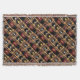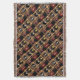 Diese zeitgenössische Throwdecke kennzeichnet ein wiederholendes abstraktes Muster einer aufrechten roten und schwarzen Flasche Burgunder-Weins nahe bei drei weiteren Flaschen in einem Braun, in einem Gold und gelben hölzernen in einem Weingestell. Ein rustikaler orange Backsteinmauerhintergrund schließt die Zusammensetzung ab.