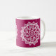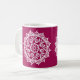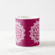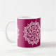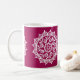 Dieses weiße Mandala sitzt auf einem dunkelrosa-roten Hintergrund. Die Farbe ist sehr reich und raffiniert. Teil der Brosya Mandala Kollektion.