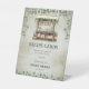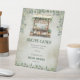Schöner Wald und Salbei grünen Eukalyptus und Boutique Farmer's Market "Rezpe Card" Schild Design. Rustikaler, altertümlicher Vordergrund kombiniert mit dem grünen Holzständer und dem umgebenden Eukalyptus erinnert an einen offenen italienischen oder landschaftlichen Marktplatz.