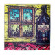 Eine Flasche Wein mit Korkenwein-Öfen auf kariertem Tischdecken, gelbe Wände mit Fensterfront im Hintergrund, wo der Blick auf die Landschaft den Ton für die Zuschauer Set. Wein mit Blick auf das Kunstwerk des Künstlers Jason Girard