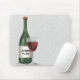 grüne Flasche Wein mit Zitat auf dem Etikett mit Glas Rotwein auf texturiertem grauen Hintergrund