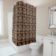 Dieser farbenfrohe Duschvorhang weist ein sich wiederholendes abstraktes Muster auf: eine aufrechte rote und eine schwarze Bordeaux-Flasche, neben drei weiteren Flaschen in einem braunen, goldenen und gelben Holzweinständer. Ein rustikal orangefarbener Backstein rundet die Komposition ab.
