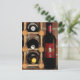 Diese farbenfrohe Postkarte bietet ein einfaches Stillleben einer aufrechten Flasche Wein neben drei weiteren Flaschen in einem Holzweinständer. Ein rustikaler Backsteinboden vervollständigt die Komposition.