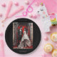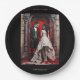 A Gothic Wedding couple dressed in wedding attire standing under a Roman archway. The background is dramatically painted in shades of red, evoking a sense of blood splatter, which adds a dark and eerie atmosphere to the scene. The groom is wearing a black suit with a red boutonniere, and his hair is styled in a sleek, gothic manner. The bride is in a white dress adorned with intricate patterns, her long dark hair complementing the gothic theme. Both characters have pale complexions and an ethereal presence, further emphasizing the gothic aesthetic. The overall mood is a blend of romance and macabre, characteristic of gothic art.