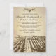 Vintage Weinkellerei des Toskanischen Weingutes Einladungen zum Hochzeitsfeiern - eine Weinbergslandschaft am Boden. Die Spitze hat ein Design von Trauben, Weinbergen und Blätter. Der Hintergrund ist ein Vintages oder gedrucktes altes Pergamentpapier.