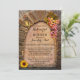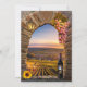 Romantische Probe Dinner Einladung mit einem Weinthema mit einem antiken Steinbogen mit Laterne, Trauben und Sonnenblumen und auf der Rückseite ein Gemälde eines Sonnenuntergangs auf einem Weinberg mit Weinflasche und Gläsern.