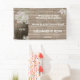 Altes Weinfass mit Ihren Initialen, rosa Blume und Gipskraut auf Stallholz Hintergrund. Personalisieren Sie mit Ihren Namen und Datum, um das perfekte Banner für Ihre Country Rustic Wedding zu erstellen.