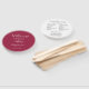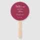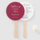Hochzeitstag-Programm gedruckt auf einem runden Handventilator, der einen trendigen, weinroten Hintergrund auf der Vorderseite mit den Braut- und Bräutigamen in weißem, stilisiertem Skript aufweist. Auf der Rückseite des Programms sind die Teilnehmer der Hochzeitsfeier und die Zeremonie-Rites auf weißem Hintergrund mit dunkelgrauer Schrift aufgeführt. Bearbeiten Sie den Handventilator und ersetzen Sie die Informationen zum Hochzeitsprogramm durch Ihre eigenen. Ideal für eine Hochzeitsfeier im Innen- oder Außenbereich! Wählen Sie die gewünschte Anzahl von Hand-Lüfterprogrammen aus.