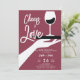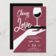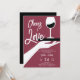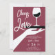 Eine moderne, elegante und schicke Duscheinladung mit einem Thema der Weinprobe. Es zeigt eine Vintage inspirierte Darstellung einer Hand, die ein Tablett mit einem Weinglas hält, und den Titel "Cheers to Liebe" in einem spielerischen, modernen Drehbuch. Eine schicke Weinprobe Polterabend Einladung für ein modernes Ehepaar, das Wein und das Weinerlebnis Liebe.