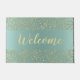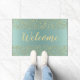 Weises Grün mit GoldMusiknoten-willkommene Matten-Fußmatte. Ein Blätternblumenmuster der musikalischen Anmerkungen und der Clefs im Gold auf einer blassen en-grün grauen Steigung. Elegant, bereiten themed Dekor der Musik vor, um zu mischen und Match für Ihr Zuhause, Studio oder spezielles Ereignis. Ändern Sie den Text zu allem, das Sie wollen, oder verlassen Sie ihn, wie ist, ein einfaches Willkommen. Wenn Sie es zu mehr als ein Wort oder zwei ändern, müssen möglicherweise Sie den besonders anfertigen Knopf anklicken und den Text passen kleiner lassen. Zu tun ist einfach. Ein wunderbares Housewarminggeschenk für Ihren Lieblingsmusiker oder Musikfreund.