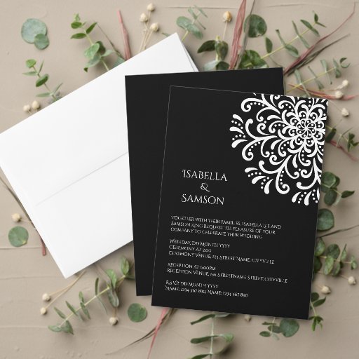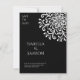 Feiern Sie Ihren besonderen Tag mit einer Touch von Eleganz und Eleganz mit unserem einzigartigen und kunstvoll gestalteten Hochzeitsinklusiv-Set. Mit einem schwarzen Hintergrund und einem faszinierenden, weißen, rotationssymmetrischen Muster von Wimpern und Punkten, die ein blumengeschmücktes Muster bilden, vereint diese Einladung wunderbar das Wesen zeitloser Romantik und modernen Charmes. Dieses einladende Set eignet sich ideal für Paare, die eine Mischung aus zeitgenössischem Design und klassischer Eleganz suchen, die den Ton für eine Hochzeitsfeier, die wegen ihrer Schönheit und Anmut in Erinnerung bleiben wird, Set gibt. Bestellen Sie noch heute Ihre Trauung und machen Sie Ihre Hochzeitsankündigung unvergesslich!