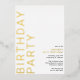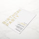 Moderne, minimale Art Geburtstagseinladungen mit einem geschlechtsneutralen Design. Grosser Text der "BIRTHDAY PARTY" und "Geburtstag des Namens" werden in echter metallischer Folie gedruckt, während der Text der Veranstaltungsdetails in matt schwarz gedruckt wird, um leicht lesbar zu sein. Goldfolie auf luftig weißem Hintergrund.
