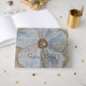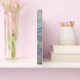 Elegante Aquarellfarben mit weißer und goldener Blüte in Blau- und Rosatönen.