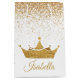 Bezaubernde kundenspezifische mittelgroße Geschenktasche getan im Weiß, wenn die Grafiken einer goldtone Krone und des Glitters, um die Spitze besprüht sind. Personifizieren Sie den Namen, auf der Front der Tasche, um zu lesen was Sie wollen. Große Geschenktasche passend für irgendeine Alter Prinzessin.