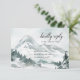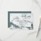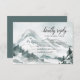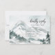 Diese schöne, schneebedeckte RSVP-Karte zeigt die alpine Wasserfarbenszene mit immergrünen Bäumen auf hellweißem Hintergrund. Die Worte "Kindly Antwort" sind in einem handgeschriebenen kalligraphischen Schriftart. Auf der Rückseite der Karte befindet sich ein grüner Waldhintergrund. Die Namen der Braut und des Bräutigams und das Hochzeitstag sind in weiß.