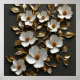 Verziertes Design mit mehreren künstlerischen Blumenelementen. Die Blume sind in Weiß mit goldenen Konturen dargestellt und zeigen aufwändige Details in den Blütenblättern und in den Mittelpunkt.