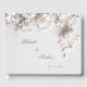 Dieses elegante, stilvolle Hochzeitsgästebuch im Quiet-Luxury-Stil zeigt weiße skulpturierte Rosen auf weißem Hintergrund, den Namen des Brautpaares in einer eleganten modernen Schrift und handgeschriebener Kalligrafie.