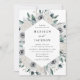 Elegante blumengeschmückte Einladungen mit Ihren Hochzeitsdetails, gerahmt von weißen Aquarellanemonen, Elfenbein-Rose und dunkelgrünen Blätter. Die weißen Anemone Hochzeitseinladungen kehren zurück, um einen schönen dunklen Salbei grünen Aquarell zu zeigen.