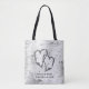 Weiße Birken-Tasche mit zwei geschnitzten Herzen auf einer Seite. Fügen Sie unten Text für ein Hochzeitsereignis hinzu, mit den Namen der Braut und des Bräutigams und dem Datum der Hochzeit. Realistischer Birkenrücken als Hintergrund, der sich um die andere Seite wickelt. Herzen und Text sind nur auf einer Seite. Diese Totetasche mit Allover-Print ist gefüttert und hat einen schwarzen Griff. Verwenden Sie sie als Willkommens-Tüten für Gäste, geben Sie sie an Mitglieder der Hochzeitsgesellschaft, personalisieren Sie sie für Brautjungfern und Mütter.