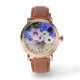 Elegante Blumenuhr, blaue, rosa, weiße Rosen und Anemonen auf grauem Hintergrund mit bedruckten rosa Edelsteinen.