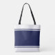Dieses elegante, sportliche Design zeichnet sich durch einen farbenprächtigen, marineblauen, breiten Mittelstreifen aus, der auf einem hellen, knalligen, weißen Hintergrund mit schwebenden, passenden Pinstreifen hervorgehoben ist.