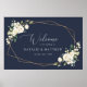 Fügen Sie Ihrer Hochzeitsfeier eine persönliche Touch mit diesen stilvollen und unvergesslichen Party hinzu! Das Design zeichnet sich durch weiße Aquarellfarben-Blume, Grünpflanzen und goldene Rahmen auf marineblau-blauem Hintergrund aus.