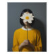 Stilvolles, minimalistisches Foto von einer Frau mit schwarzem Bob-Haarhaar, die ein gelbes Kleid trägt, das eine schlichte weiße Blume in den Händen hält