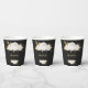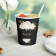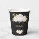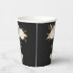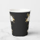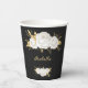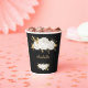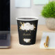 Schöne weiße Blume und goldene Blätter, schwarzer Papierbecher