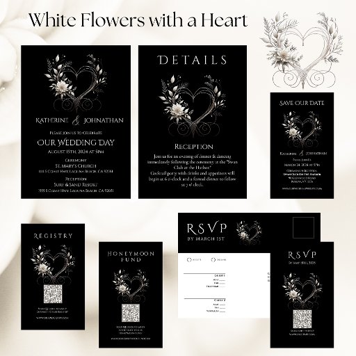 Mit dieser modernen Einladung zum Hochzeitsfeiern mit weißen Blume und einem Herz in einem schwarzen Hintergrund stärken Sie Ihre Hochzeit. Dieses zeitgenössische Design verströmt Eleganz und Set für ein stilvolles Fest. Der beeindruckende Kontrast und der elegante Schriftart auf hochwertigem Karton machen diese Einladung zu einem Kunstwerk: Genießen Sie mit dieser luxuriösen und unvergesslichen Ankündigung das Wesen Ihrer Liebe. Bestellen Sie jetzt Ihre Hochzeit mit modernem Charme und zeitloser Eleganz. Wählen Sie diese Weiße Blume mit einem Herzthema und feiern Sie den Reichtum Ihrer Liebe in jedem Detail.