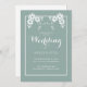 Blaue Hochzeitseinladung mit weißem Text und Blumenakzenten an der Spitze eines dünnen Randes. Farben und Text sind online mit wenigen Klicks vollständig editierbar, aber wenn Sie Hilfe benötigen, kontaktieren Sie den Designer unter ArtByLiz@gmx.com und die Karte wird für Sie kostenlos angepasst.