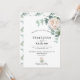 Ein schick weißer Hintergrund. Weiße, wasserfarbene Bauern, Blume mit Blumen und Eukalyptusgrün. Personalisieren und fügen Sie Ihre Namen und Hochzeitsdetails. Schwarze Buchstaben. Zurück: ein Muster von Eukalyptus und Oliven-Blätter.