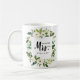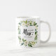 Vor der Hochzeit, zeigen Sie Ihren zukünftigen neuen Nachnamen mit diesem lustigen THE future MRS. Typografie TASSE mit einem Blumenrahmen aus weißen Rosen und Blätter Koordiniert mit White Bloom Hochzeitskollektion und Zubehör.